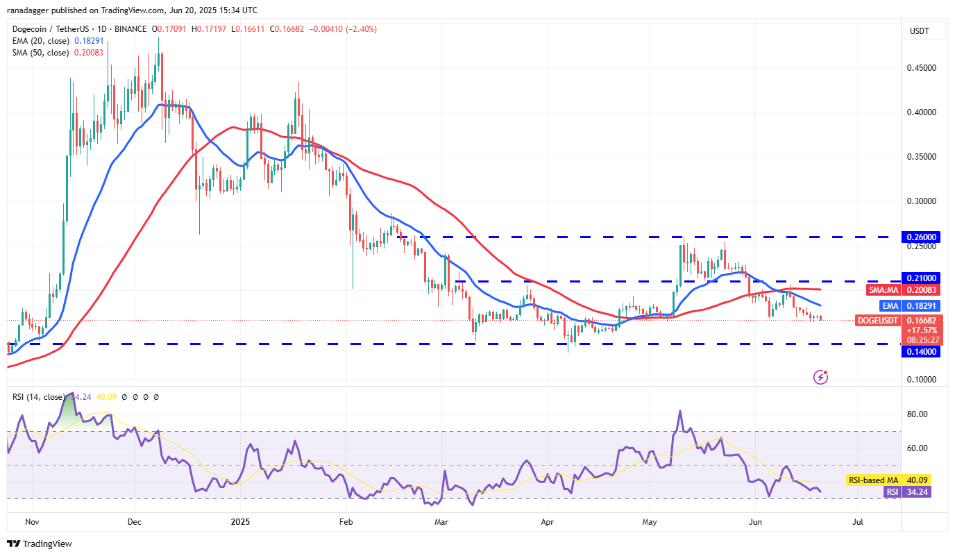 Si el nivel de $ 0.16 se grieta, doGe/USDT puede caer hacia el apoyo crucial de $ 0.14. Es probable que los toros compren agresivamente si el par rebota en la marca de $ 0.14. Si la pareja se rompe por encima de la EMA de 20 días, podría permanecer en el rango de $ 0.14 a $ 0.26 por un poco más de tiempo.