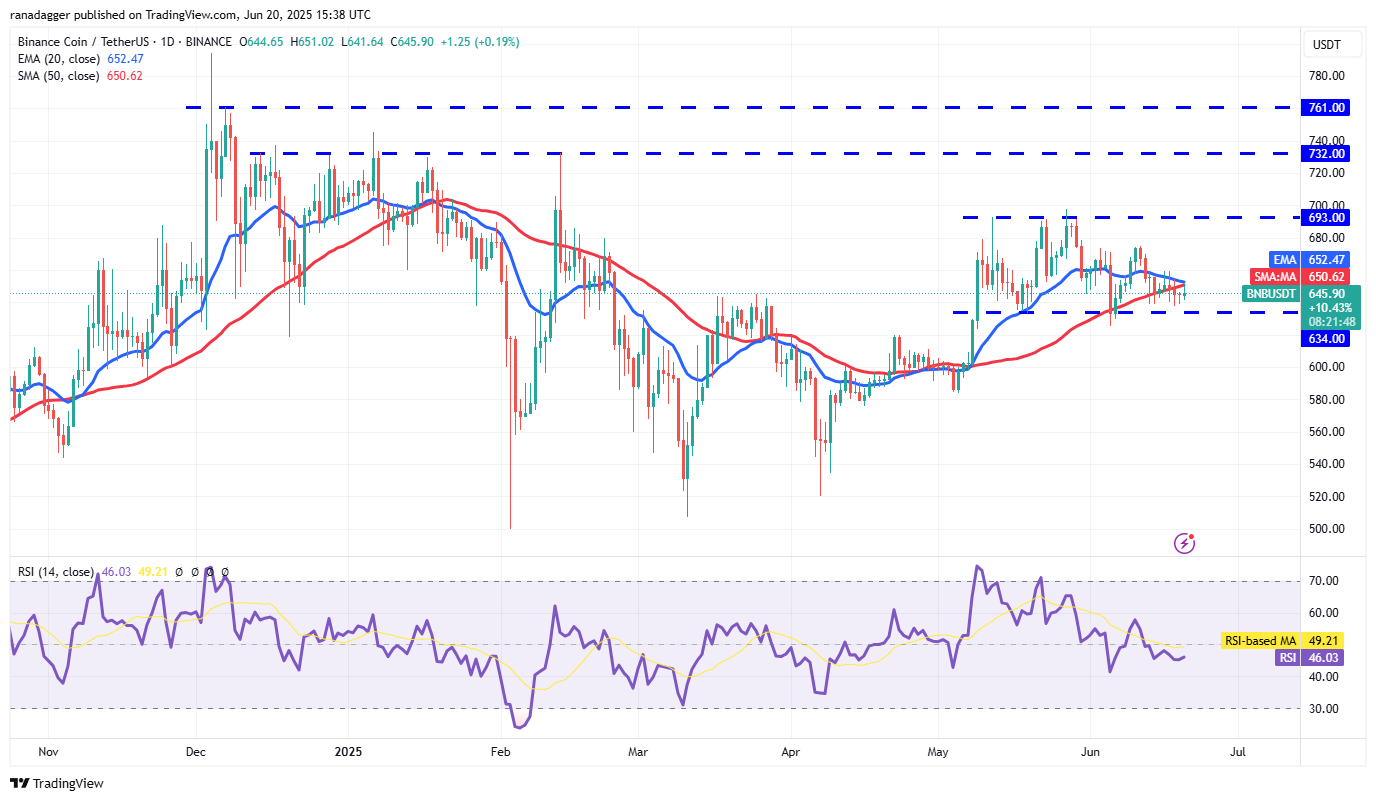 Si el precio aumenta y se rompe durante la EMA de 20 días, indica que BNB/USDT podría permanecer en el rango de $ 634 a 693 durante varios días. Un cierre por encima de $ 693 cambiará la tendencia a favor de los toros.