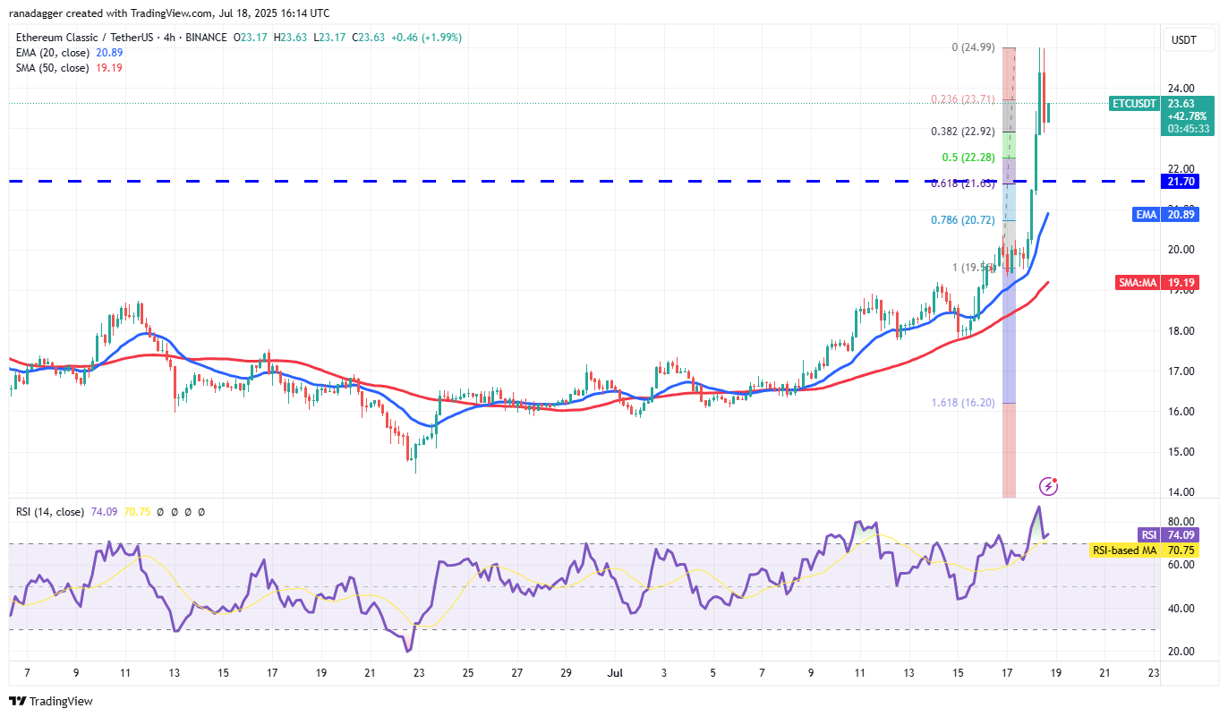 Una fuerza relativa positiva (RSI) y un promedio móvil exponencial de pendiente ascendente (20 días, $ 113,984) indican la ventaja de un comprador. La tendencia alcista de BTC/USDT podría reanudarse si los toros generan el precio a $ 123,218. Este par puede aumentar hasta $ 135 729 antes de alcanzar el objetivo del patrón de $ 150,000.