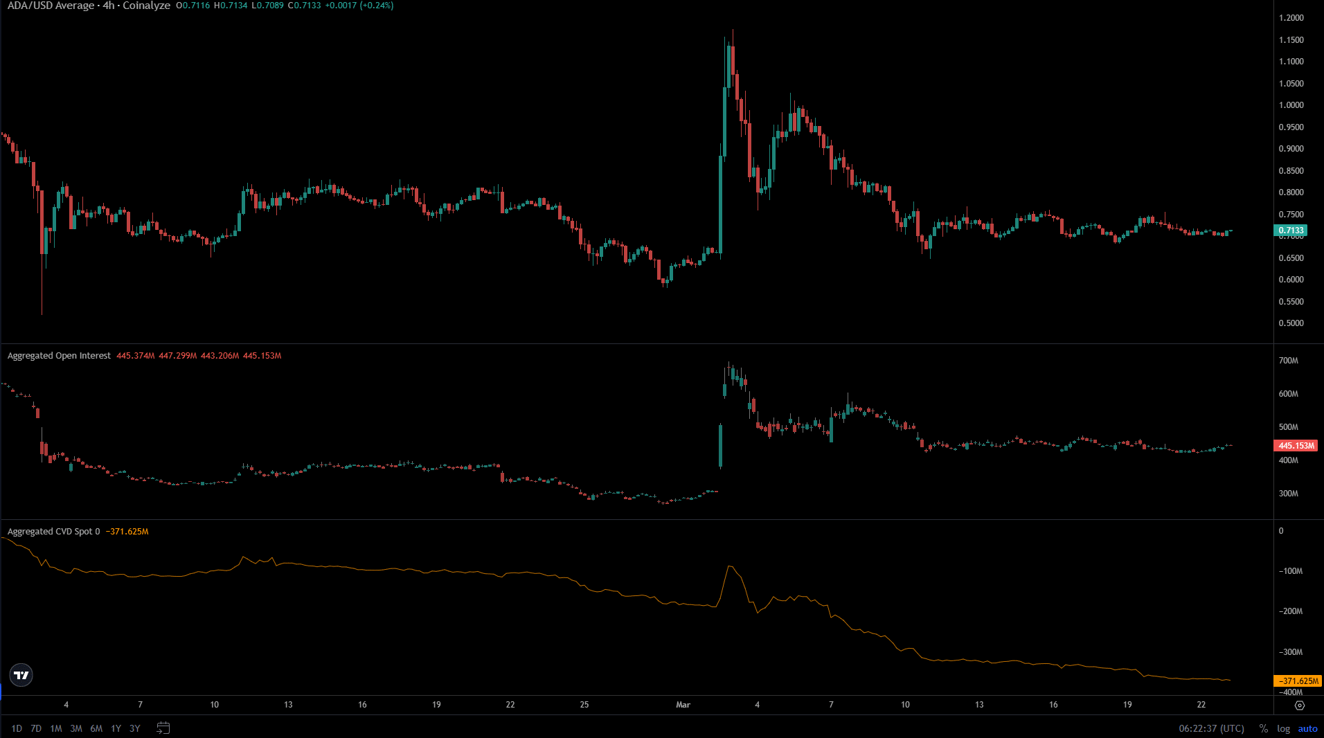 Cardano parecía estar luchando con su recuperación y moviendo más allá de la resistencia de $ 0.8. La falta de actividad tanto en el mercado spot como en el mercado de derivados era indicativo de un estado de ánimo bajista.