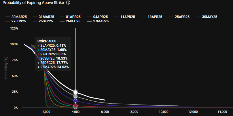 Los operadores de opciones de Deribit no esperan alcanzar la meta de $ 4K hasta septiembre (un 10% de probabilidad). ETH actualmente está valorado en $ 1.87,000, un 54 por ciento menos que el pico de diciembre de $ 4,000.
