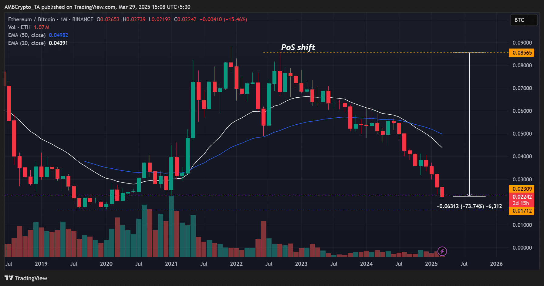 Ethereum [ETH] Desde más de tres años, el valor de Bitcoin ha disminuido. La tasa ETH/BTC, una métrica que rastrea el rendimiento relativo de ETH en comparación con BTC, es la mejor manera de demostrar esto. Recientemente, alcanzó un mínimo de 0.022%.