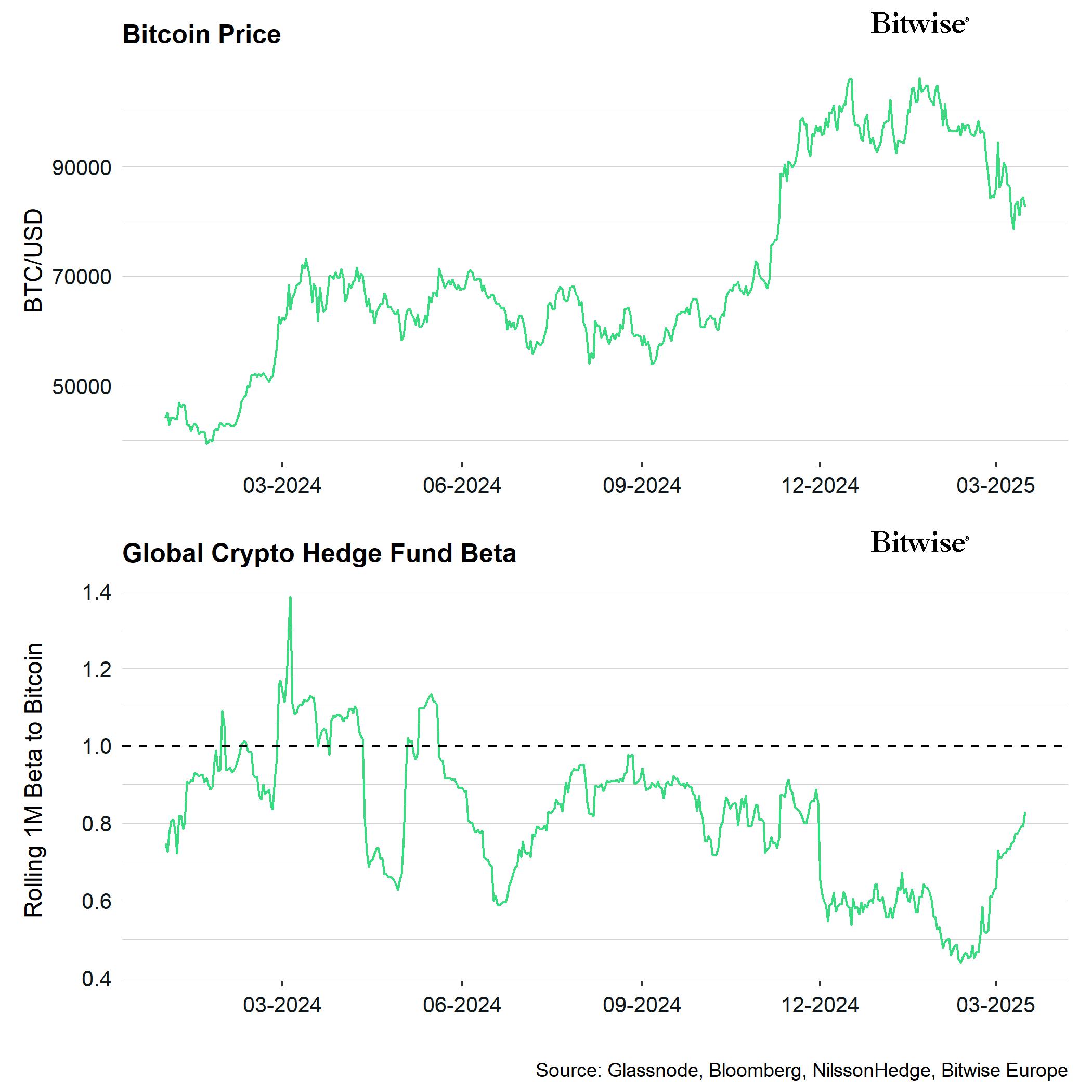 Los fondos de cobertura criptográfica están implementando un beta de 1 mes para bitcoin. Fuente: Glassnode/Bloomberg