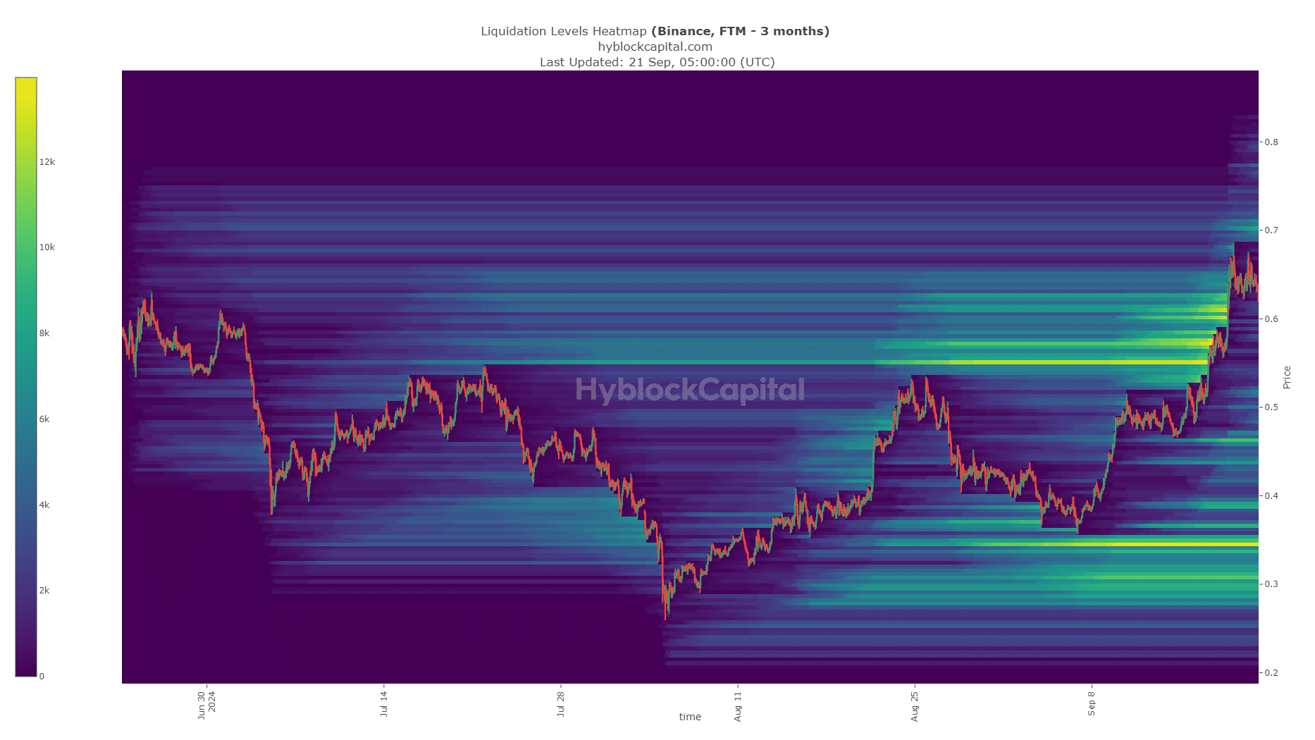 El mapa de calor de liquidación mostró un fondo de liquidez que oscilaba entre $0,546 y $0,626. La zona que estuvo cubierta durante el repunte de la semana pasada ahora se ha reducido a una pequeña área alrededor de la marca de $0,63.