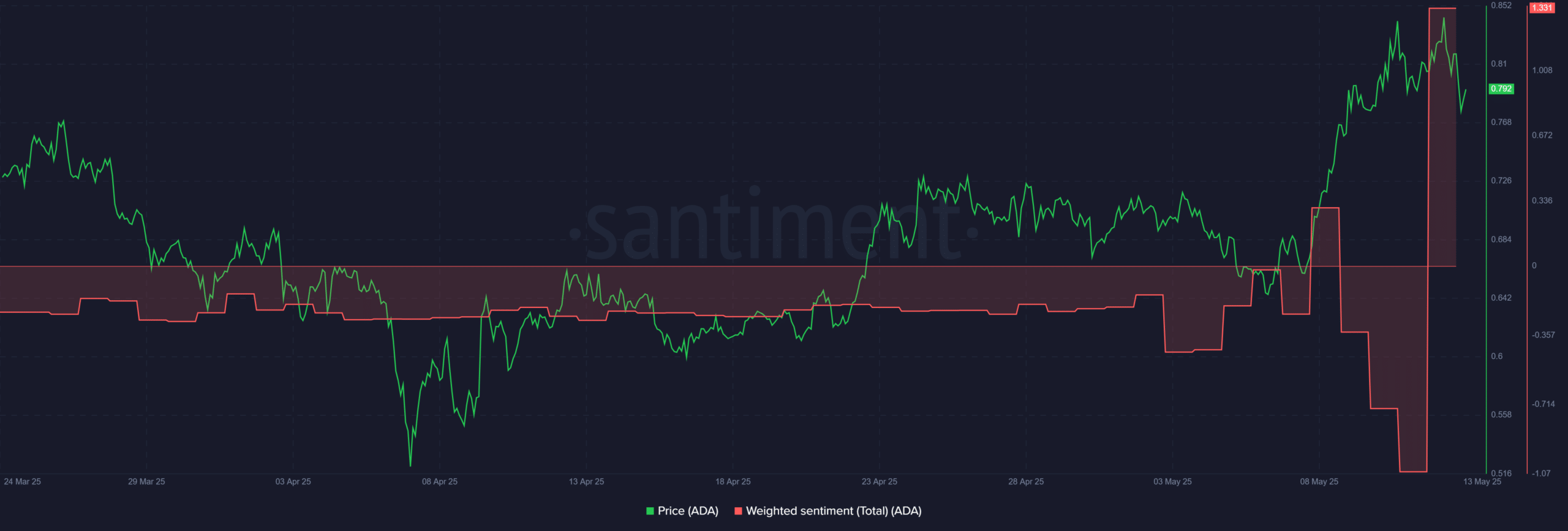 Curiosamente, el sentimiento del mercado hacia ADA no parecía verse afectado por esta discusión en curso. El sentimiento general ponderado saltó al territorio positivo.