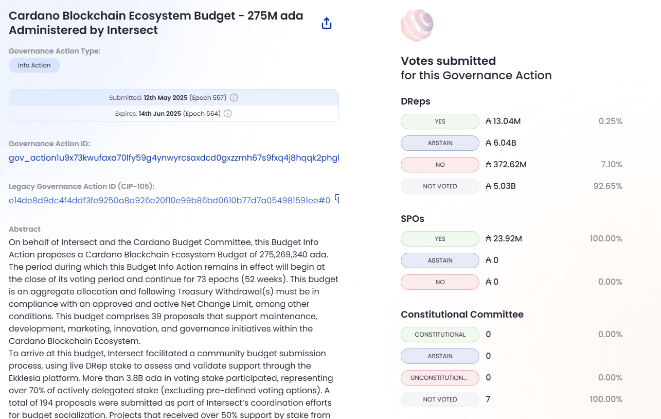 La propuesta debe ser aprobada y fondos disponibles. Cardano El Tesoro, los miembros clave de la gobernanza, los representantes delegados y los Comités de Cívicos Intersectados (ICC) deben votar.
