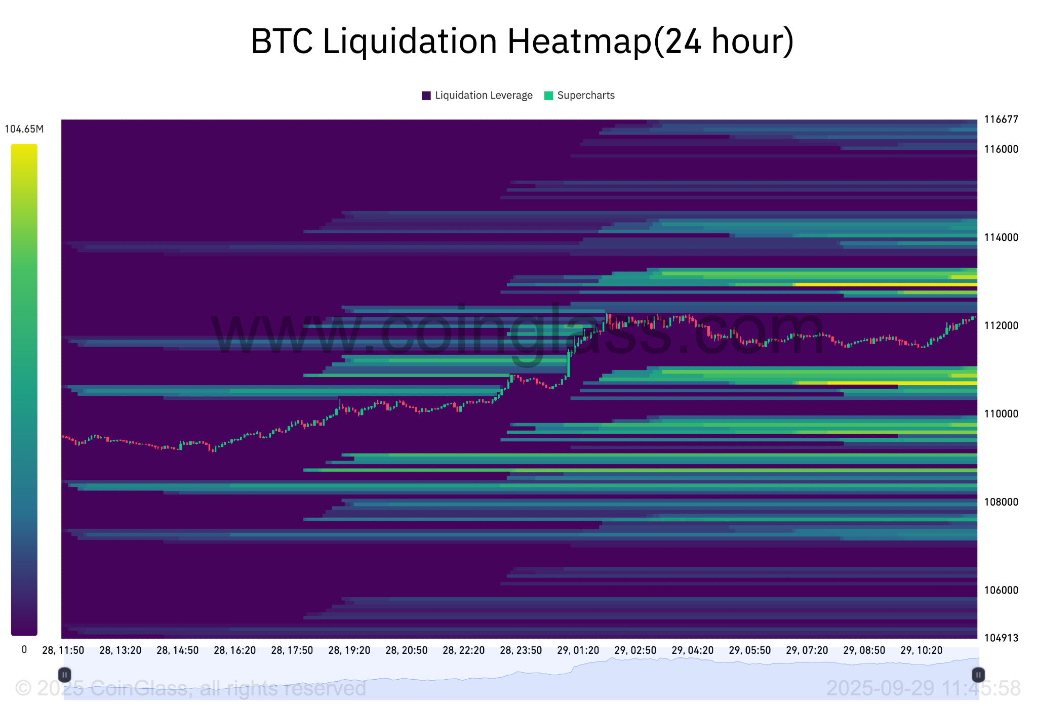 El mapa de calor de las transacciones de bitcoin de 24 horas mostró que el precio de BTC puede apuntar a grandes bloques de liquidez cuando aumenta. Entre $ 112,350 y $ 114,000 hay más de $ 612,000,000 en orden entre.