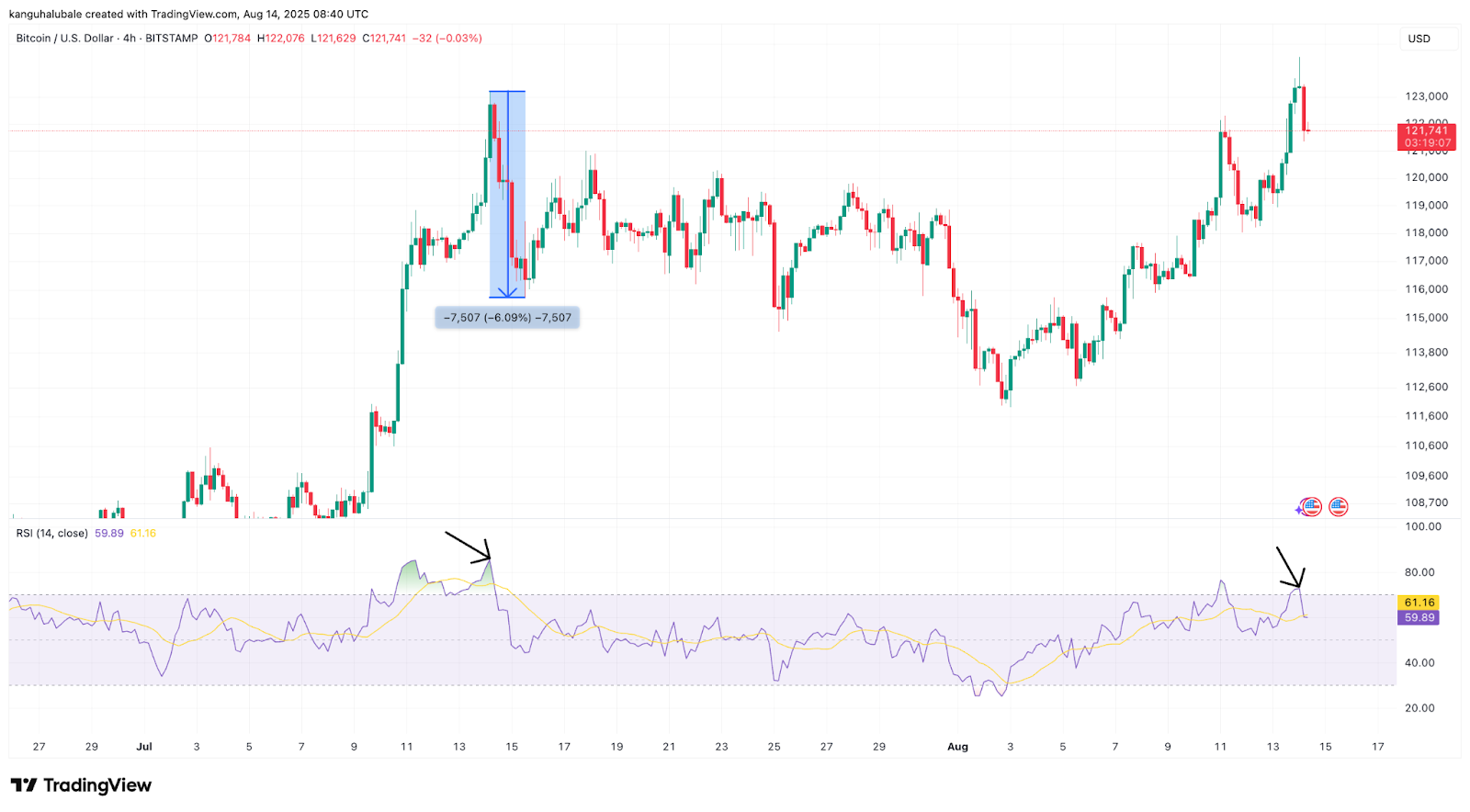 El cuadro a continuación muestra que el retroceso de precio de $ 121,000 a 124,000 fue el resultado de los niveles de sobrecompra. La reciente carrera de Bitcoin hasta su precio anterior resultó de una condición de sobrecompra. máximos de todos los tiempos de $ 123,000 en julio Además, se precedió una reducción del 6% a $ 115,000.
